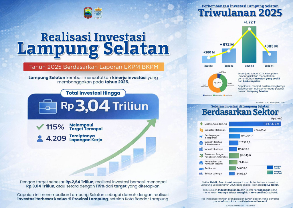 Dengan capaian tersebut, Lampung Selatan tercatat sebagai kabupaten dengan realisasi investasi tertinggi di Provinsi Lampung pada 2025, meski masih berada di bawah Kota Bandar Lampung yang membukukan nilai investasi sebesar Rp3,835 triliun.
